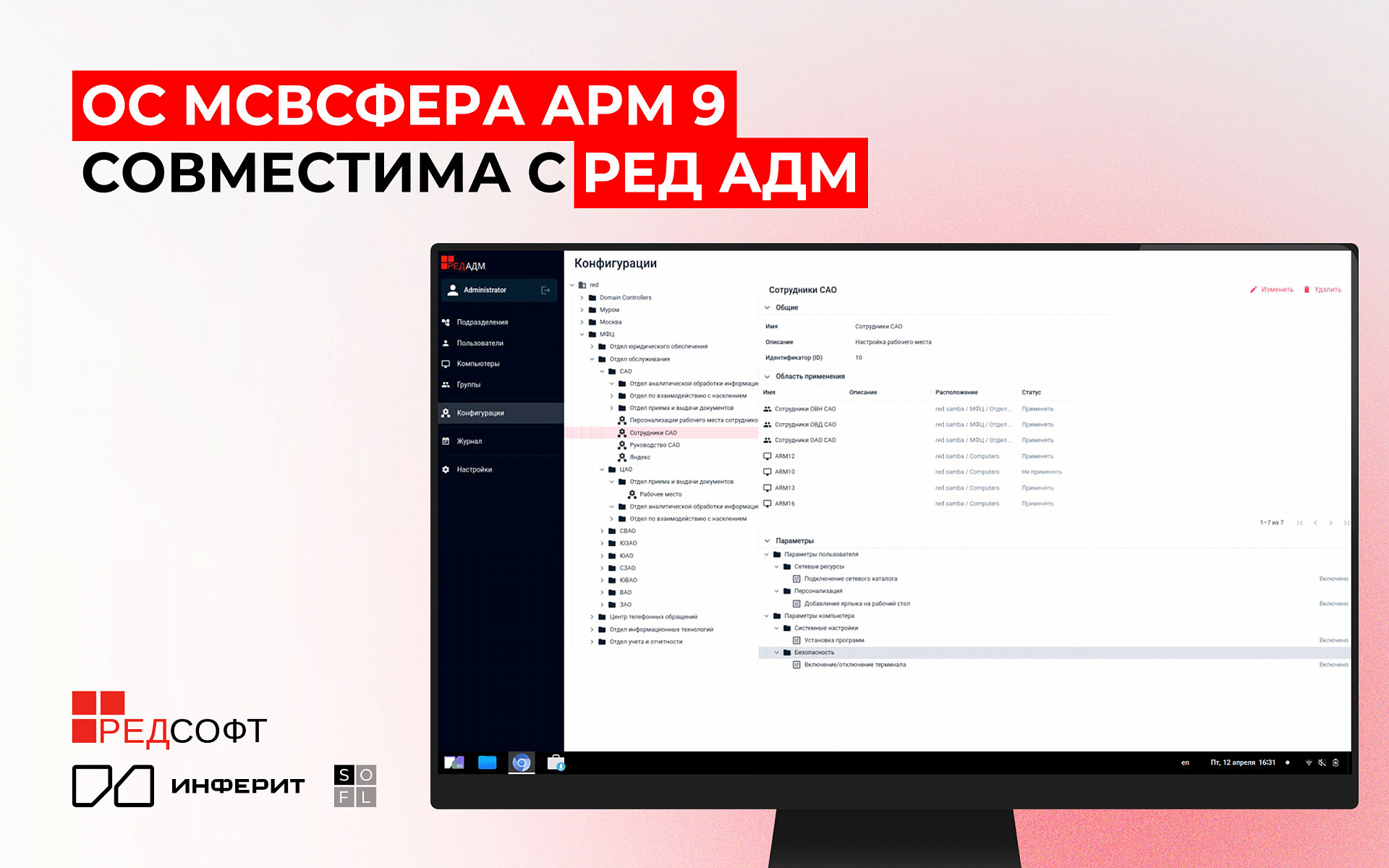 Российский вендор оборудования и ПО для ИТ-инфраструктуры «Инферит» (ГК Softline) и «РЕД Софт» объявили о завершении успешных испытаний на совместимость операционной системы «МСВСфера АРМ» 9 с комплексным решением для администрирования ИТ-инфраструктуры «РЕД АДМ». Интеграция позволяет создавать единое защищенное пространство для управления рабочими станциями на основе отечественных технологий, что соответствует стратегии ГК Softline по построению технологического суверенитета России.